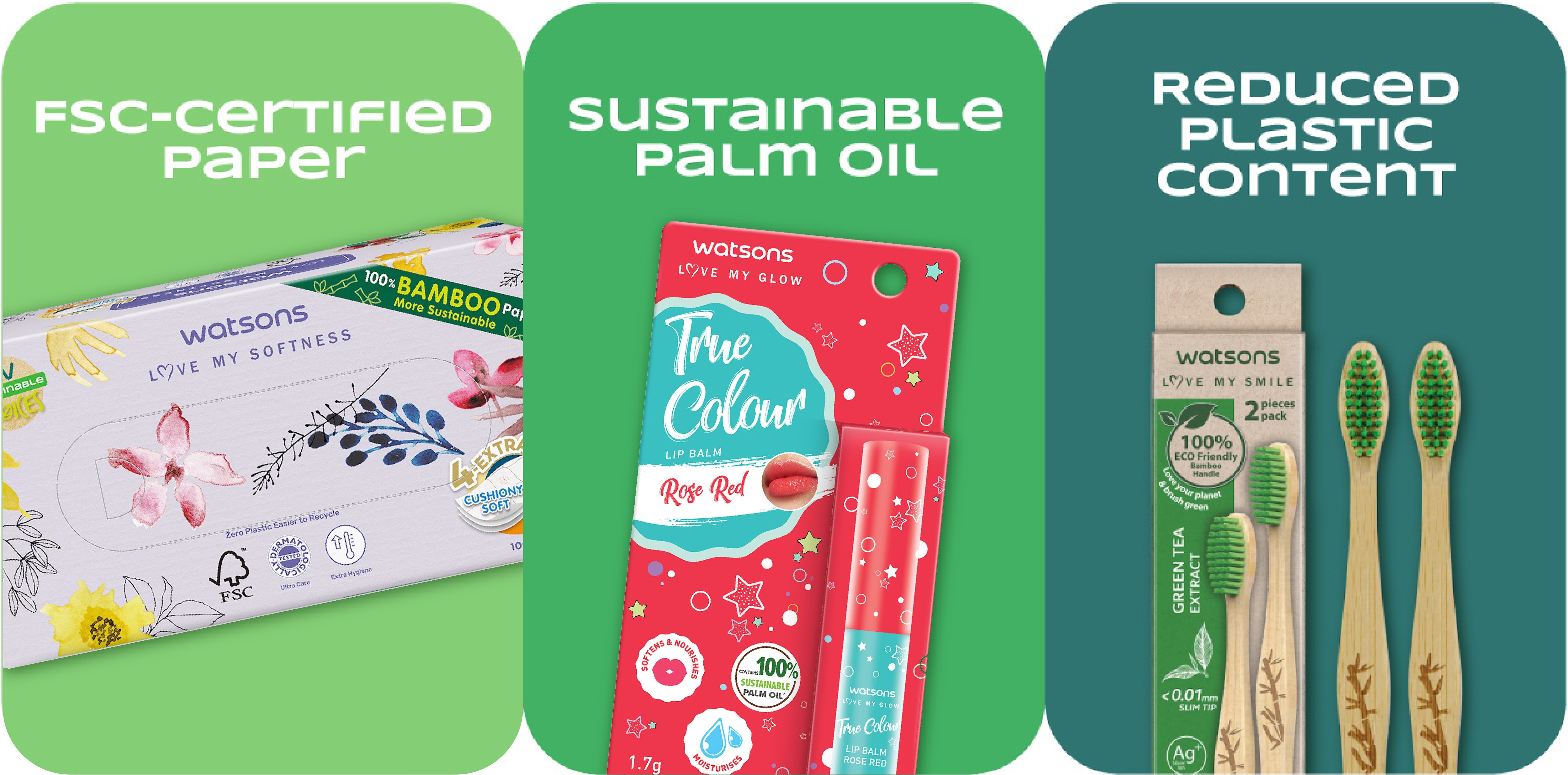 At Watsons, we promote products made with responsibly sourced ingredients and materials, while reducing the use of virgin resources. These criteria help ensure our products support responsibly managed forests and plantations, and make use of recycled materials whenever possible.